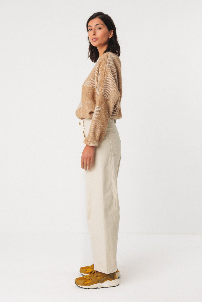 Premium knit sweater in recycled alpaca blend, made in Portugal. Medium weight, it has a cropped cut, a boat neckline and long sleeves.