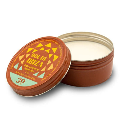 Sol de Ibiza Natural Mineral Sunscreen SPF30 is een volledig natuurlijke zonnebrandcrème in een aluminium blikje. Gemakkelijk aan te brengen, transparant en waterbestendig.