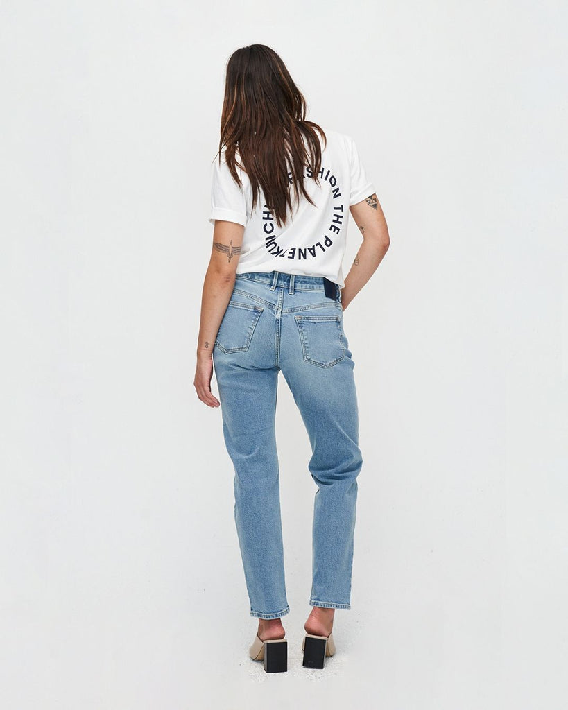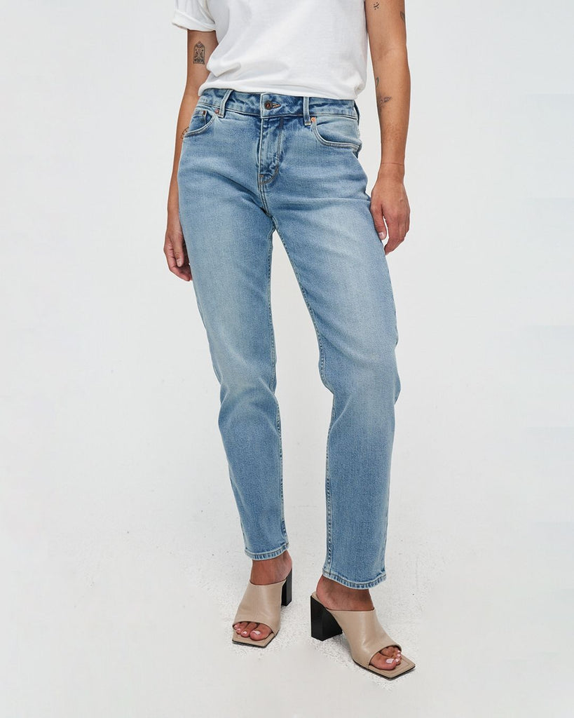 Met de Jenna in onze collectie hoef je niet meer de spijkerbroek van je vriend te stelen. Jenna is onze nieuwe boyfriend jeans met een relaxte pasvorm en een lichte wassing. De spijkerbroek heeft een middelhoge taille en is gemaakt van gerecycled en biologisch katoen.