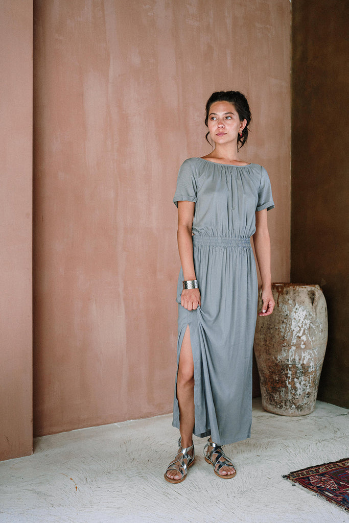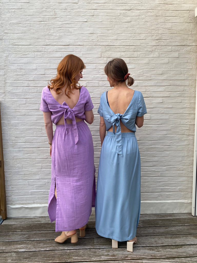 De Radhika jurk van JLABEL heeft een prachtige lavendel kleur en een opvallende open rug met strik detail. Het model heeft een ronde hals, korte mouwen, elastiek in de taille en 2 flappen op de rug die gestrikt worden. Wanneer je een BH of bikini draag met een dunne rugband kan deze precies onder de strik (of draag haar zonder bh). Ze is gemaakt van 'dead stock' (overgebleven stof) viscose, dat kwalitatief en heerlijk zacht aanvoelt.
