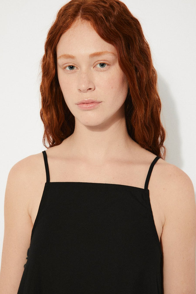Flared midi dress in cotton fabric with a square neckline and elasticated low back. Style with thin straps and inserted side pockets. Unlined.