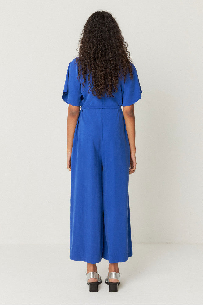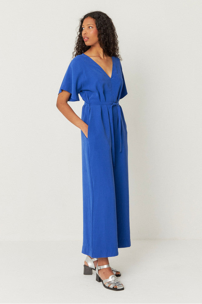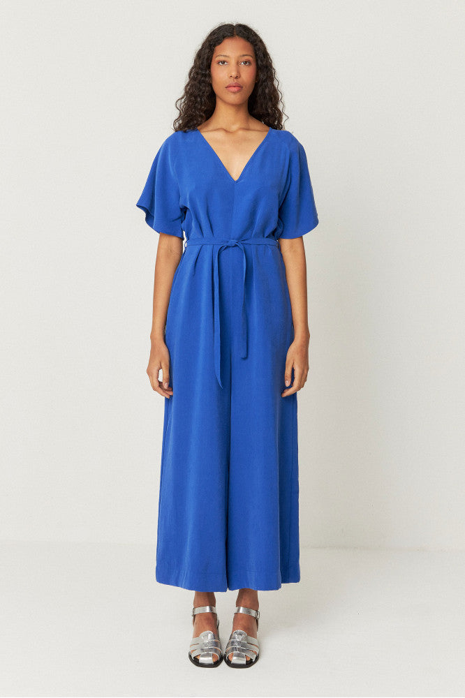 Loose fit jumpsuit with short dolman sleeves. Deep V neckline and side pockets at the seams.