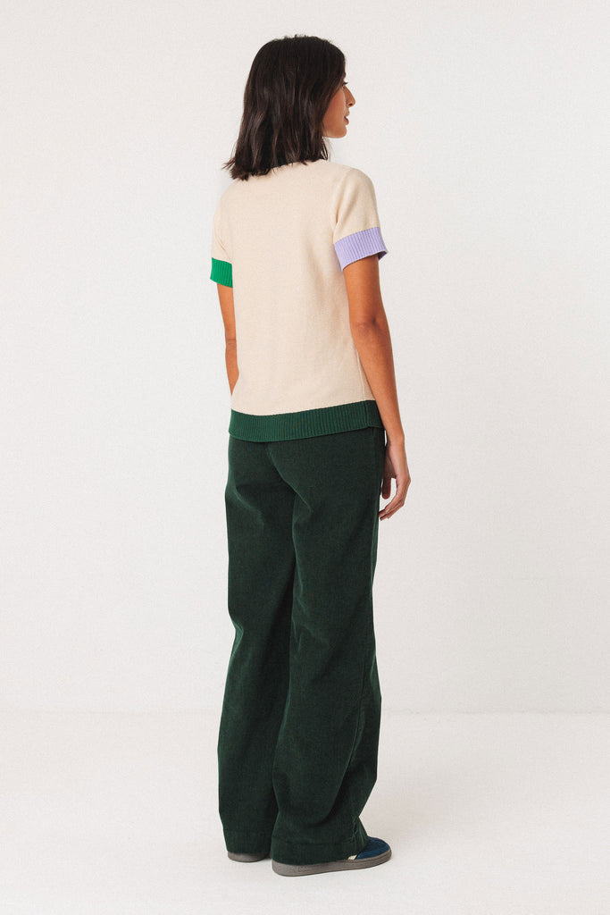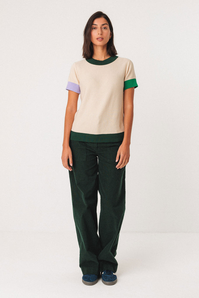 Lightweight knit top in GOTS certified organic cotton. It has a straight cut, a round neck, short sleeves. There is contrasting ribbed trim on the collar, sleeves and waist.