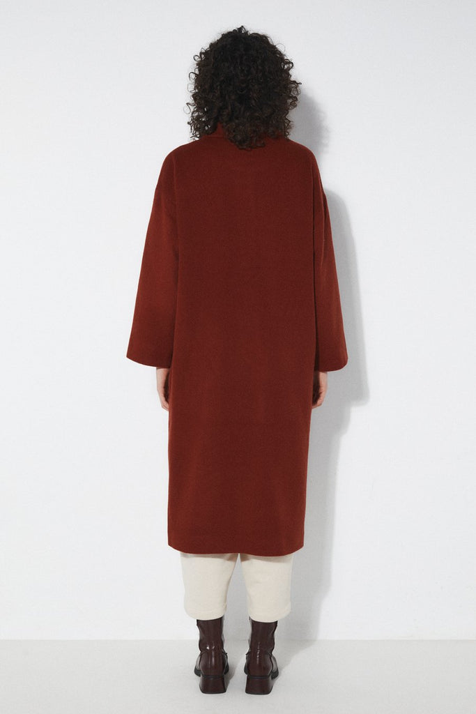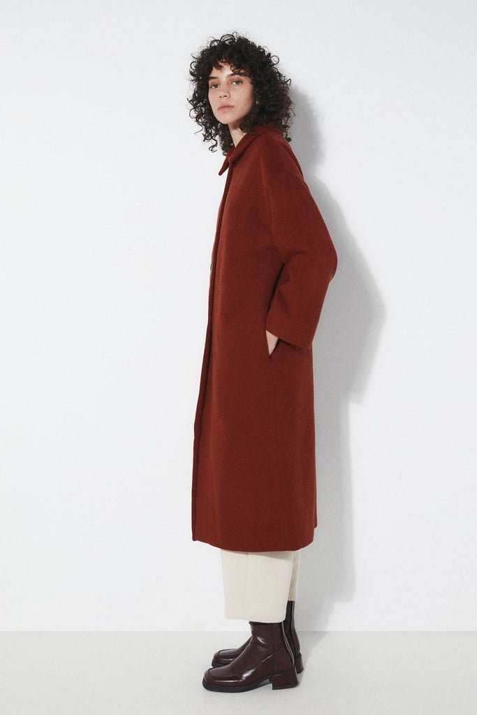 Straight coat with notch lapels and button closure. Single-breasted style with inset side pockets and opening at the back. Lined.