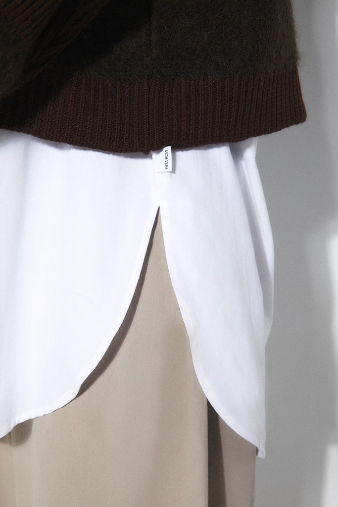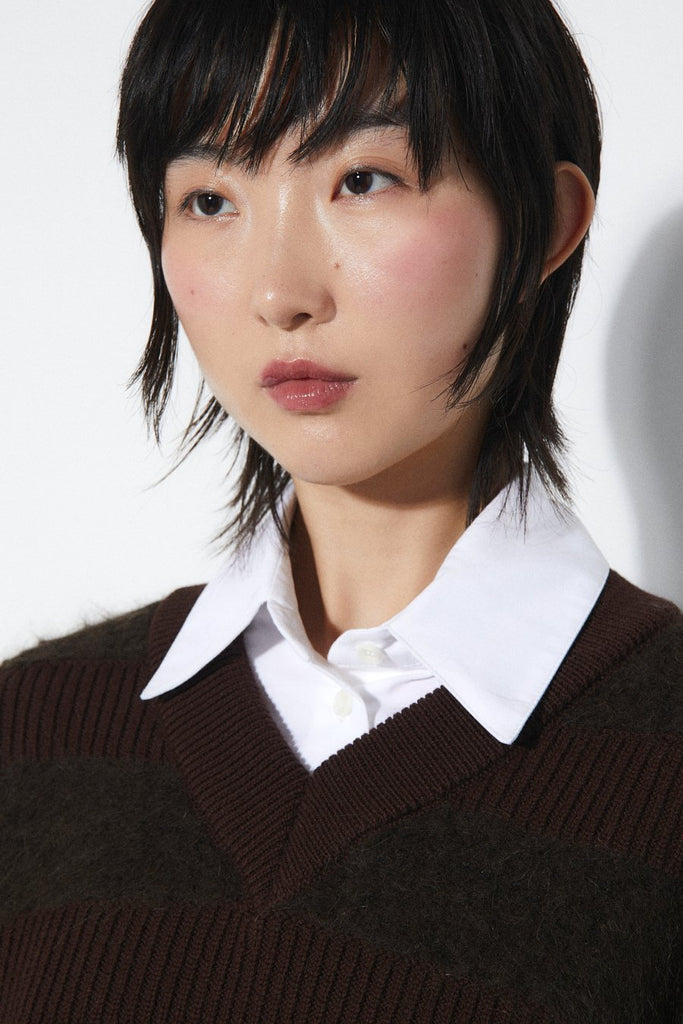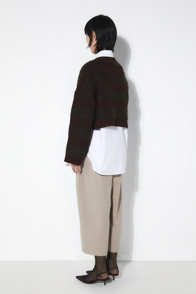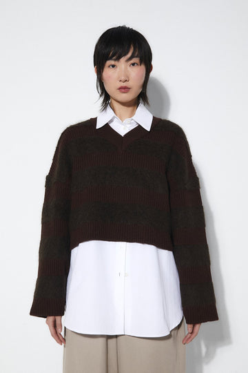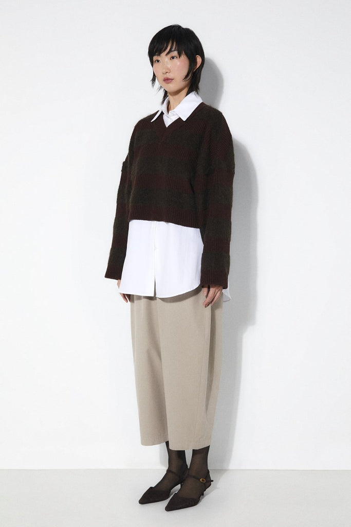 Short textured knit sweater with a V-neckline. Loose-fit style with markedly dropped shoulders and wide sleeves.