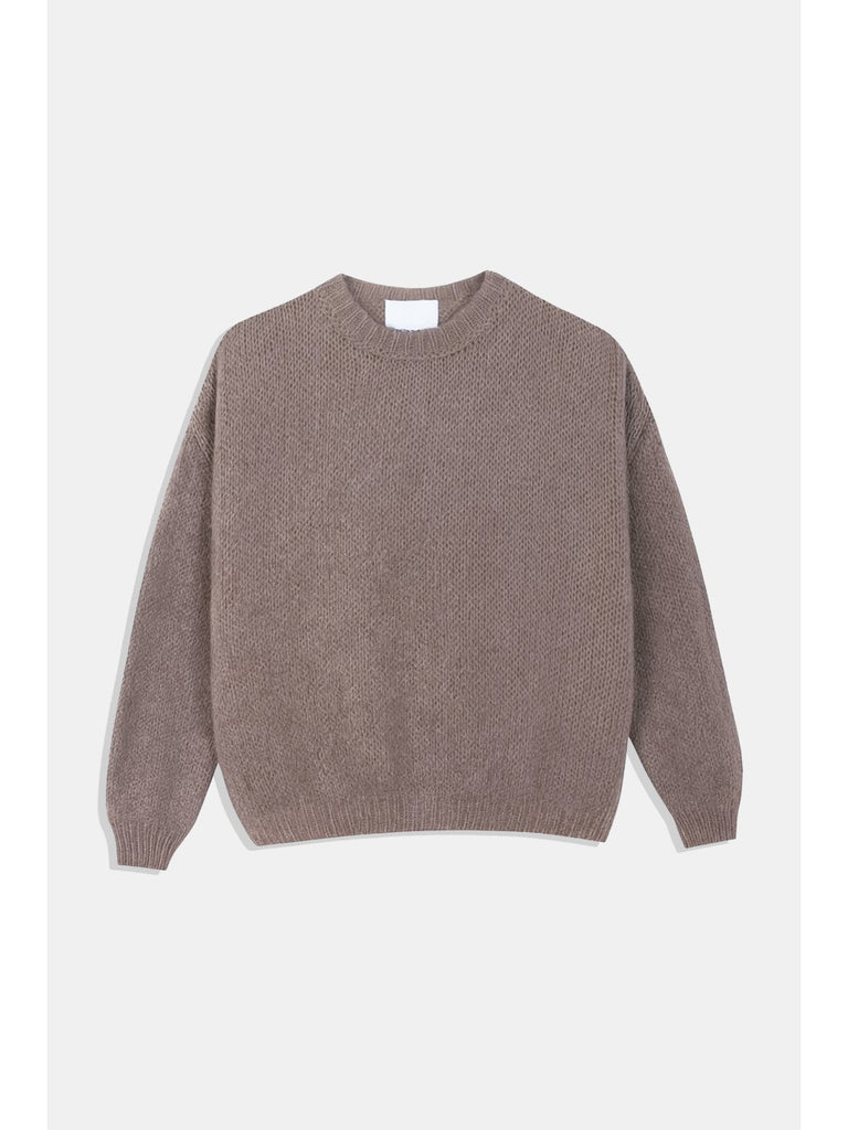 Oversized sweater in soft wool and mohair knit. Dropped shoulder style with ribbed trim on the collar, cuffs and hem.